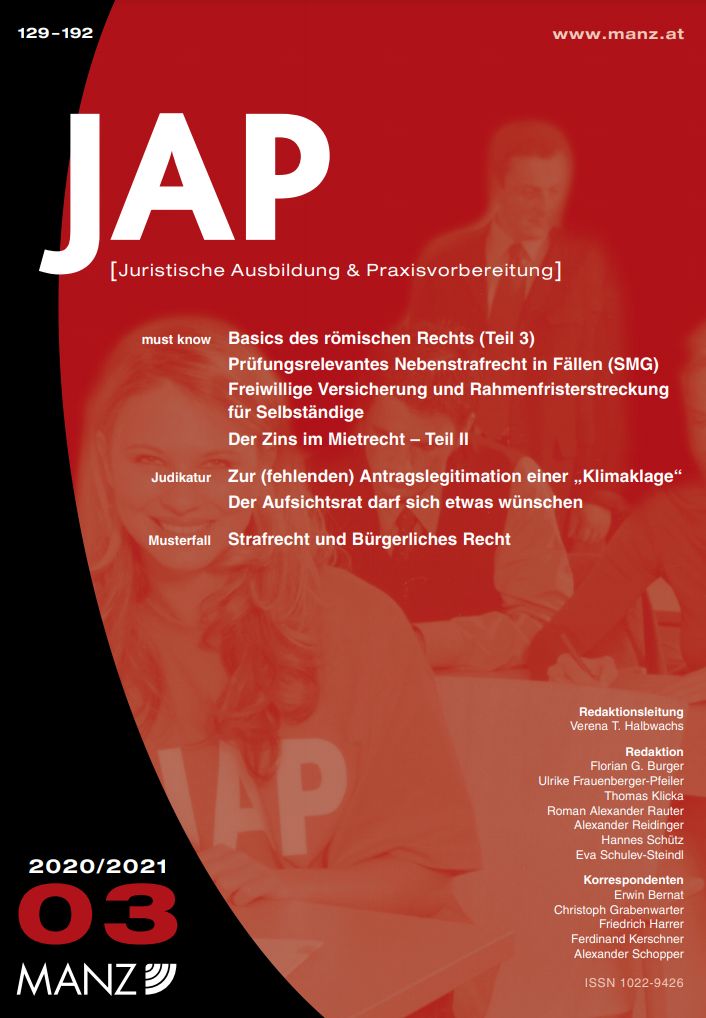 Die Zeitschrift JAP hält dich in allen wichtigen Rechtgebieten auf dem Laufenden und bereitet dich auf deine mündlichen und schriftlichen Prüfungen im Jurastudium vor. Dich erwarten Beiträge zu allen prüfungsrelevanten Fächern: Zivil- und Zivilverfahrensrecht, Öffentliches Recht, EU-Recht, Römisches Recht, Strafrecht, Arbeits- und Sozialrecht sowie Unternehmensrecht. Die Redaktion legt dabei ihren Fokus auf verständlich dargestellte Judikatur und legistische Entwicklungen und präsentiert dir Musterfälle inklusive ausführlicher Lösungen. Du wirst zusätzlich mit Informationen zu juristischen Berufen, Weitebildungsmöglichkeiten und Tipps für dein Studium versorgt.